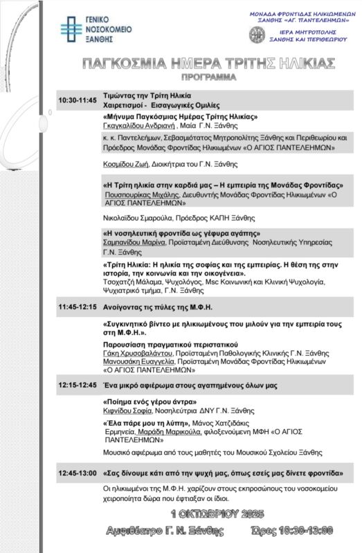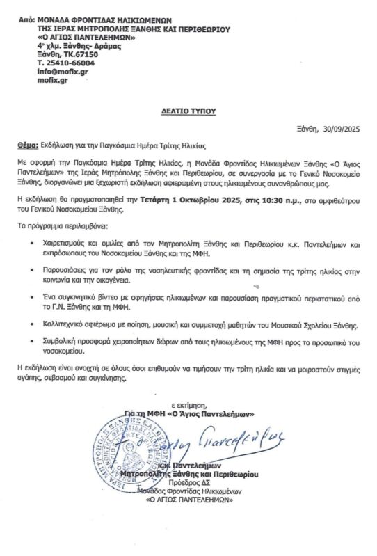 30 Sep 2025 ΔΕΛΤΙΟ ΤΥΠΟΥ : ΠΑΓΚΟΣΜΙΑ ΗΜΕΡΑ ΤΡΙΤΗΣ ΗΛΙΚΙΑΣ 30 September 2025 16 Views Ανακοινώσεις, Δελτία Τύπου, Εκδηλώσεις, Ενορίες, Επιλεγμένα, Ιερές Μονές, Ιστορικό