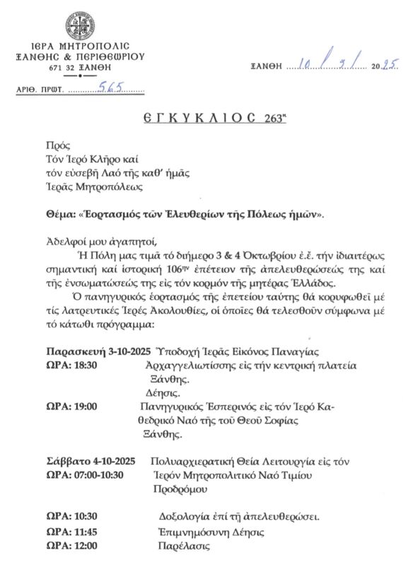 30 Sep 2025 ΕΓΚΥΚΛΙΟΣ 263η 30 September 2025 12 Views Ανακοινώσεις, Δελτία Τύπου, Εγκύκλιοι, Εκδηλώσεις, Ενορίες, Επιλεγμένα, Ιερές Μονές, Ιστορικό
