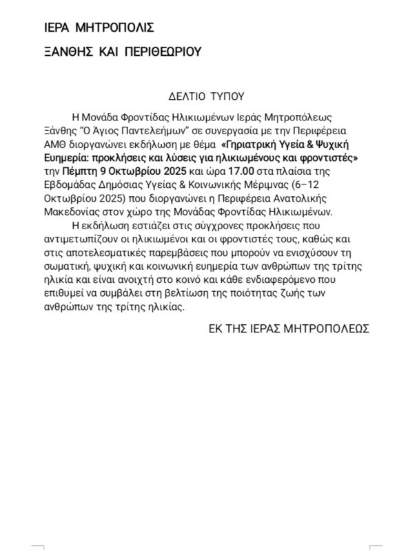 07 Oct 2025 ΔΕΛΤΙΟ ΤΥΠΟΥ 7 October 2025 25 Views Ανακοινώσεις, Δελτία Τύπου, Εκδηλώσεις, Ενορίες, Επιλεγμένα, Ιερές Μονές, Ιστορικό