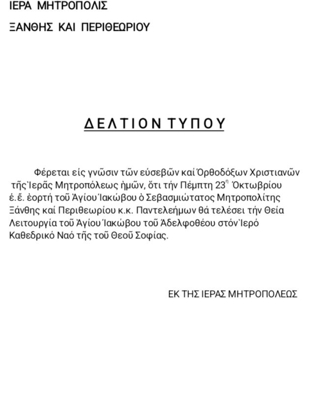 20 Oct 2025 ΔΕΛΤΙΟ ΤΥΠΟΥ 20 October 2025 13 Views Ανακοινώσεις, Δελτία Τύπου, Εκδηλώσεις, Ενορίες, Επιλεγμένα, Ιερές Μονές, Ιστορικό