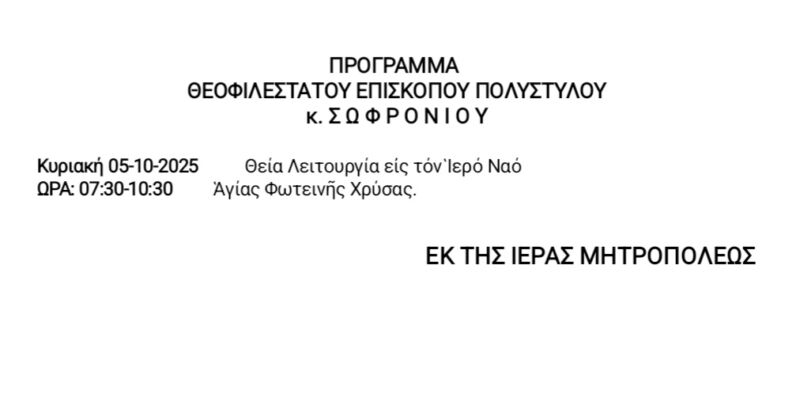 ΠΡΟΓΡΑΜΜΑ ΘΕΟΦΙΛΕΣΤΑΤΟΥ ΕΠΙΣΚΟΠΟΥ ΠΟΛΥΣΤΥΛΟΥ κ. ΣΩΦΡΟΝΙΟΥ