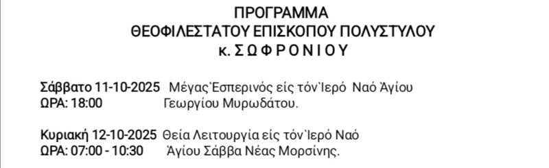 ΠΡΟΓΡΑΜΜΑ ΘΕΟΦΙΛΕΣΤΑΤΟΥ ΕΠΙΣΚΟΠΟΥ ΠΟΛΥΣΤΥΛΟΥ κ. ΣΩΦΡΟΝΙΟΥ