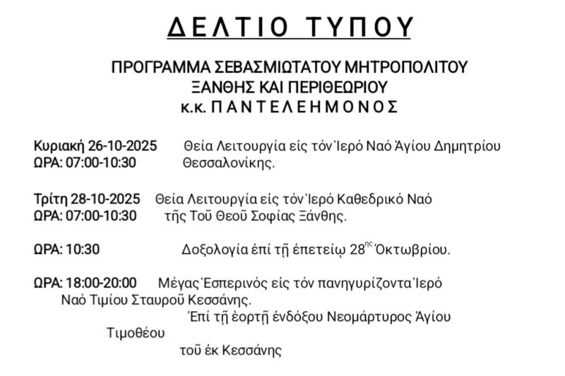 23 Oct 2025 ΠΡΟΓΡΑΜΜΑ ΣΕΒΑΣΜΙΩΤΑΤΟΥ κ.κ. ΠΑΝΤΕΛΕΗΜΟΝΟΣ 23 October 2025 25 Views Ανακοινώσεις, Δελτία Τύπου, Εκδηλώσεις, Ενορίες, Επιλεγμένα, Ιερές Μονές, Ιστορικό, Πρόγραμμα Σεβασμιωτάτου