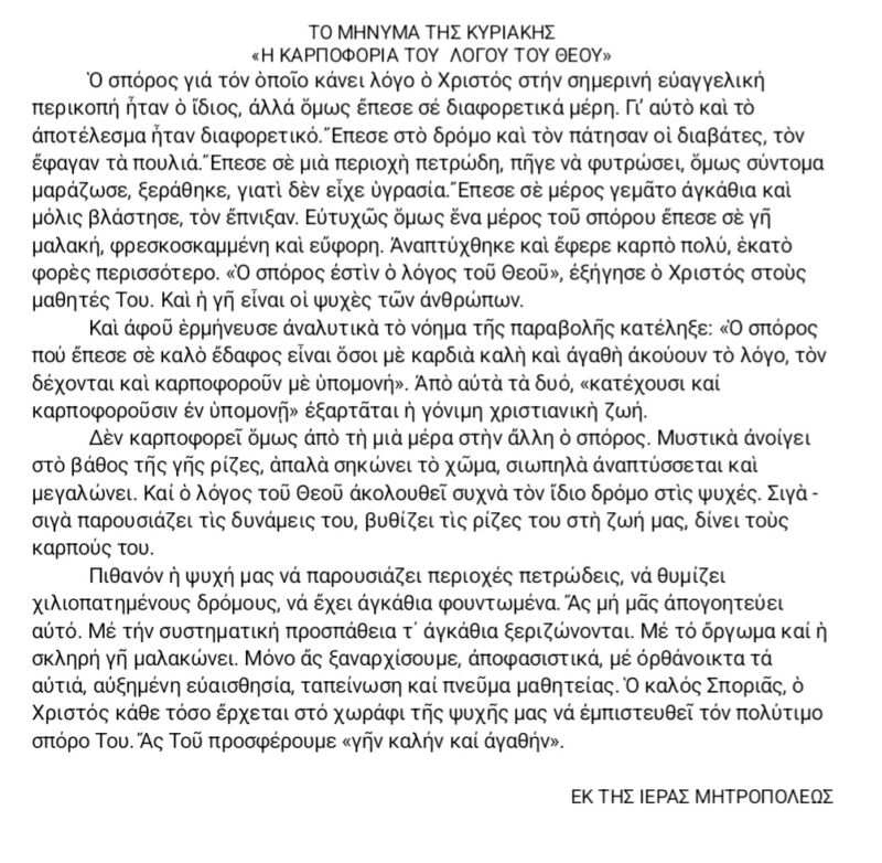 10 Oct 2025 ΤΟ ΜΗΝΥΜΑ ΤΗΣ ΚΥΡΙΑΚΗΣ 10 October 2025 12 Views Ανακοινώσεις, Δελτία Τύπου, Ενορίες, Επιλεγμένα, Ιερές Μονές, Ιστορικό, Το κήρυγμα της Κυριακής