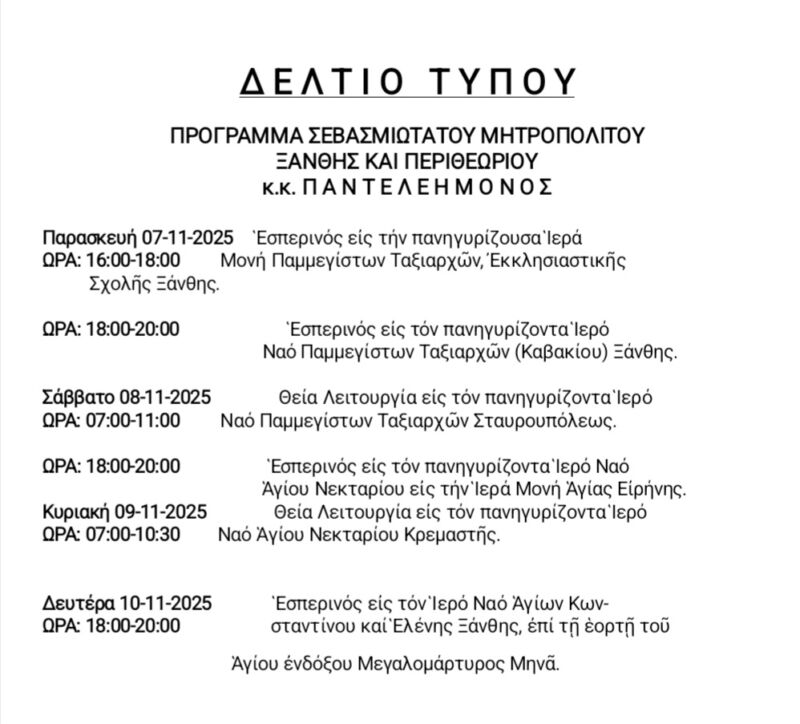 06 Nov 2025 ΠΡΟΓΡΑΜΜΑ ΣΕΒΑΣΜΙΩΤΑΤΟΥ κ.κ. ΠΑΝΤΕΛΕΗΜΟΝΟΣ 6 November 2025 7 Views Ανακοινώσεις, Δελτία Τύπου, Εκδηλώσεις, Ενορίες, Επιλεγμένα, Ιερές Μονές, Ιστορικό, Πρόγραμμα Σεβασμιωτάτου