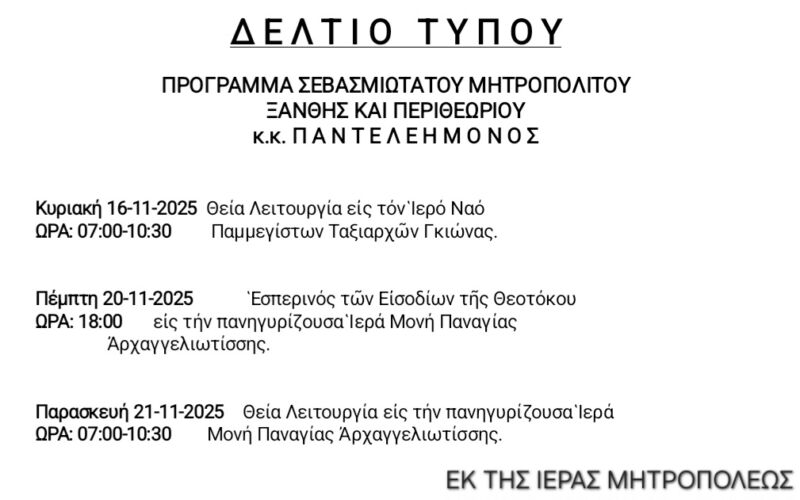 13 Nov 2025 ΠΡΟΓΡΑΜΜΑ ΣΕΒΕΣΜΙΩΤΑΤΟΥ κ.κ. ΠΑΝΤΕΛΕΗΜΟΝΟΣ 13 November 2025 29 Views Ανακοινώσεις, Δελτία Τύπου, Εκδηλώσεις, Ενορίες, Επιλεγμένα, Ιερές Μονές, Ιστορικό, Πρόγραμμα Σεβασμιωτάτου