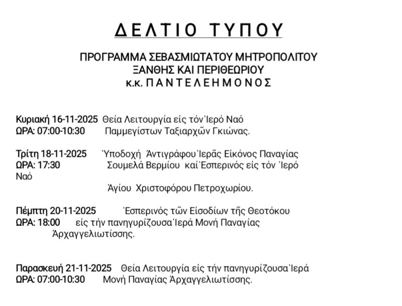 13 Nov 2025 ΠΡΟΓΡΑΜΜΑ ΣΕΒΕΣΜΙΩΤΑΤΟΥ κ.κ. ΠΑΝΤΕΛΕΗΜΟΝΟΣ 13 November 2025 204 Views Ανακοινώσεις, Δελτία Τύπου, Εκδηλώσεις, Ενορίες, Επιλεγμένα, Ιερές Μονές, Ιστορικό, Πρόγραμμα Σεβασμιωτάτου