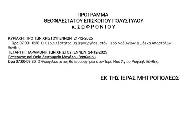 ΠΡΟΓΡΑΜΜΑ ΑΚΟΛΟΥΘΙΩΝ ΘΕΟΦΙΛΕΣΤΑΤΟΥ ΕΠΙΣΚΟΠΟΥ ΠΟΛΥΣΤΥΛΟΥ κ. ΣΩΦΡΟΝΙΟΥ