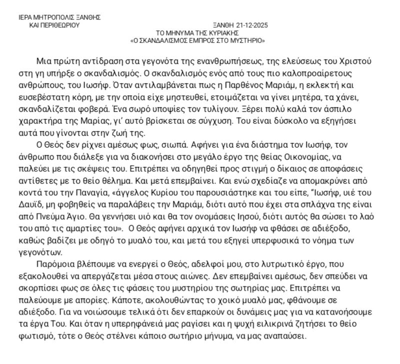 18 Dec 2025 ΤΟ ΜΗΝΥΜΑ ΤΗΣ ΚΥΡΙΑΚΗΣ 18 December 2025 7 Views Ανακοινώσεις, Δελτία Τύπου, Ενορίες, Επιλεγμένα, Ιερές Μονές, Ιστορικό, Το κήρυγμα της Κυριακής