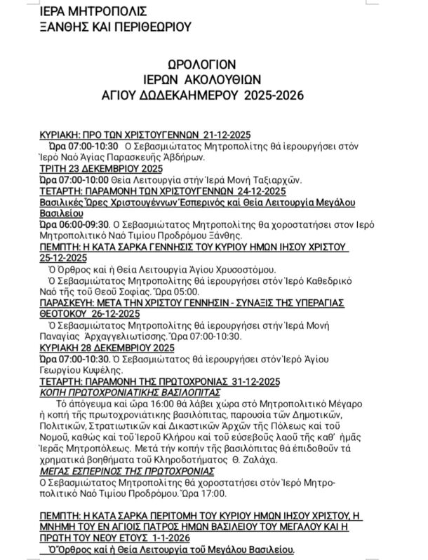 18 Dec 2025 ΩΡΟΛΟΓΙΟΝ ΙΕΡΩΝ ΑΚΟΛΟΥΘΙΩΝ ΔΩΔΕΚΑΗΜΕΡΟΥ ΣΕΒΑΣΜΙΩΤΑΤΟΥ κ.κ. ΠΑΝΤΕΛΕΗΜΟΝΟΣ 18 December 2025 13 Views Ανακοινώσεις, Δελτία Τύπου, Εκδηλώσεις, Ενορίες, Επιλεγμένα, Ιερές Μονές, Ιστορικό, Πρόγραμμα Σεβασμιωτάτου
