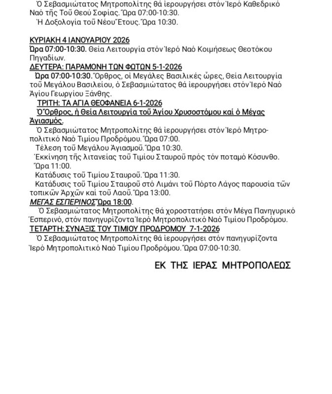 ΩΡΟΛΟΓΙΟΝ ΙΕΡΩΝ ΑΚΟΛΟΥΘΙΩΝ ΔΩΔΕΚΑΗΜΕΡΟΥ ΣΕΒΑΣΜΙΩΤΑΤΟΥ κ.κ. ΠΑΝΤΕΛΕΗΜΟΝΟΣ