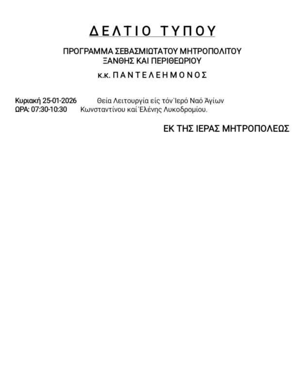 22 Jan 2026 ΠΡΟΓΡΑΜΜΑ ΣΕΒΑΣΜΙΩΤΑΤΟΥ κ.κ. ΠΑΝΤΕΛΕΗΜΟΝΟΣ 22 January 2026 10 Views Ανακοινώσεις, Εκδηλώσεις, Ενορίες, Επιλεγμένα, Ιερές Μονές, Ιστορικό, Πρόγραμμα Σεβασμιωτάτου