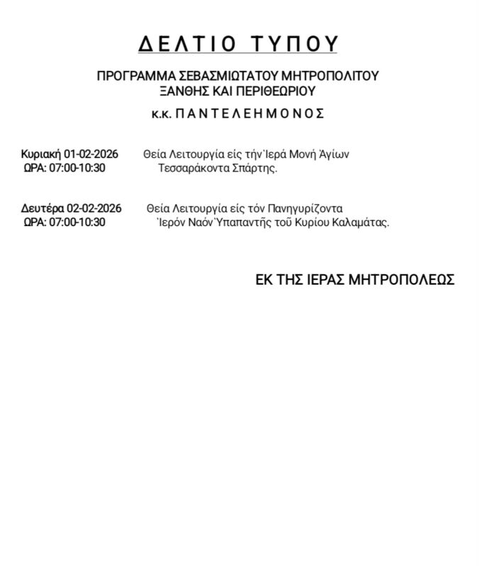 29 Jan 2026 ΠΡΟΓΡΑΜΜΑ ΣΕΒΑΣΜΙΩΤΑΤΟΥ 29 January 2026 5 Views Ανακοινώσεις, Δελτία Τύπου, Εκδηλώσεις, Ενορίες, Επιλεγμένα, Ιερές Μονές, Ιστορικό, Πρόγραμμα Σεβασμιωτάτου
