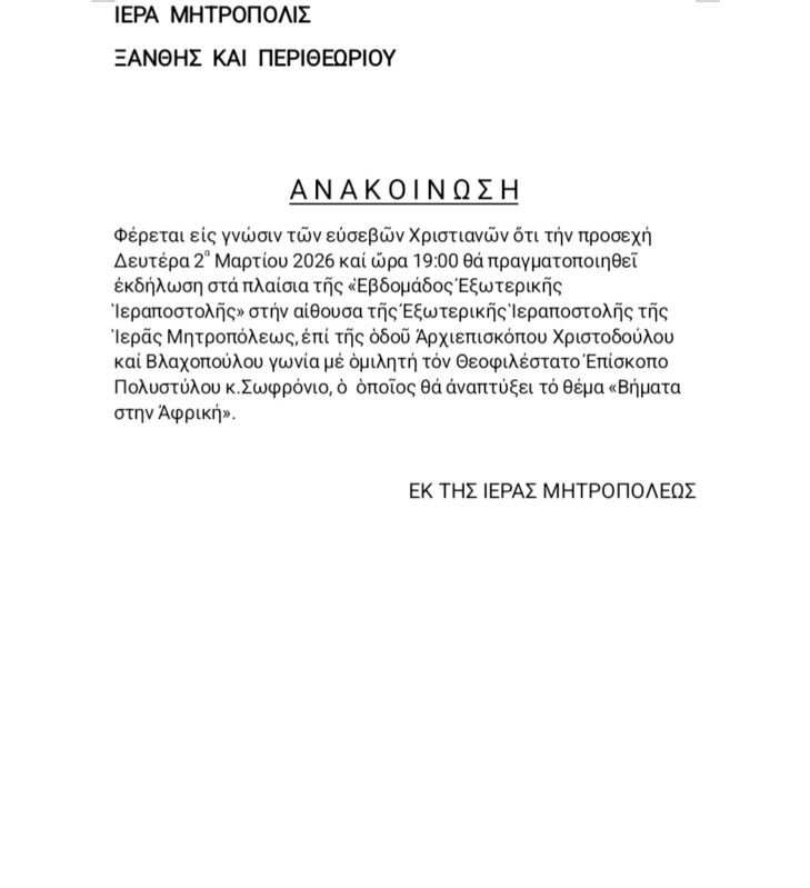 26 Feb 2026 ΑΝΑΚΟΙΝΩΣΗ 26 February 2026 16 Views Ανακοινώσεις, Δελτία Τύπου, Εκδηλώσεις, Ενορίες, Επιλεγμένα, Ιερές Μονές, Ιστορικό