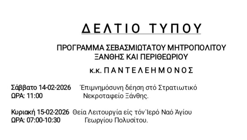12 Feb 2026 ΠΡΟΓΡΑΜΜΑ ΣΕΒΑΣΜΙΩΤΑΤΟΥ κ.κ. ΠΑΝΤΕΛΕΗΜΟΝΟΣ 12 February 2026 29 Views Ανακοινώσεις, Δελτία Τύπου, Εκδηλώσεις, Ενορίες, Επιλεγμένα, Ιερές Μονές, Ιστορικό, Πρόγραμμα Σεβασμιωτάτου