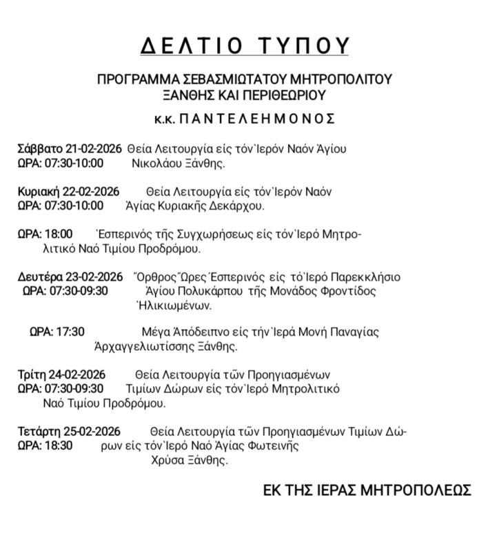 20 Feb 2026 ΠΡΟΓΡΑΜΜΑ ΣΕΒΑΣΜΙΩΤΑΤΟΥ 20 February 2026 15 Views Ανακοινώσεις, Δελτία Τύπου, Ενορίες, Επιλεγμένα, Ιερές Μονές, Ιστορικό, Πρόγραμμα Σεβασμιωτάτου