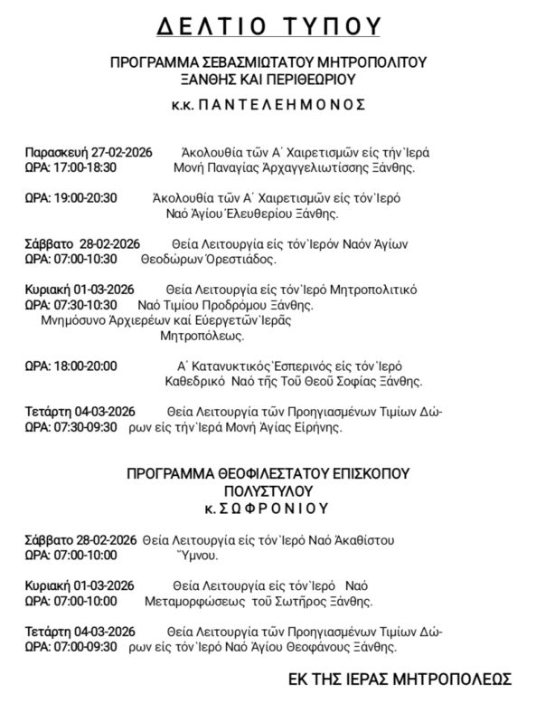26 Feb 2026 ΠΡΟΓΡΑΜΜΑ ΣΕΒΑΣΜΙΩΤΑΤΟΥ 26 February 2026 27 Views Ανακοινώσεις, Δελτία Τύπου, Εκδηλώσεις, Ενορίες, Επιλεγμένα, Ιερές Μονές, Ιστορικό, Πρόγραμμα Σεβασμιωτάτου