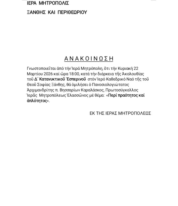 19 Mar 2026 ΑΝΑΚΟΙΝΩΣΗ 19 March 2026 4 Views Ανακοινώσεις, Δελτία Τύπου, Εκδηλώσεις, Ενορίες, Επιλεγμένα, Ιερές Μονές, Ιστορικό