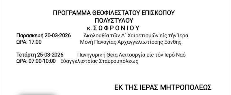 19 Mar 2026 ΠΡΟΓΡΑΜΜΑ ΘΕΟΦΙΛΕΣΤΑΤΟΥ ΕΠΙΣΚΟΠΟΥ ΠΟΛΥΣΤΥΛΟΥ κ.κ. ΣΩΦΡΟΝΙΟΥ 19 March 2026 6 Views Ανακοινώσεις, Δελτία Τύπου, Εκδηλώσεις, Ενορίες, Επιλεγμένα, Ιερές Μονές, Ιστορικό