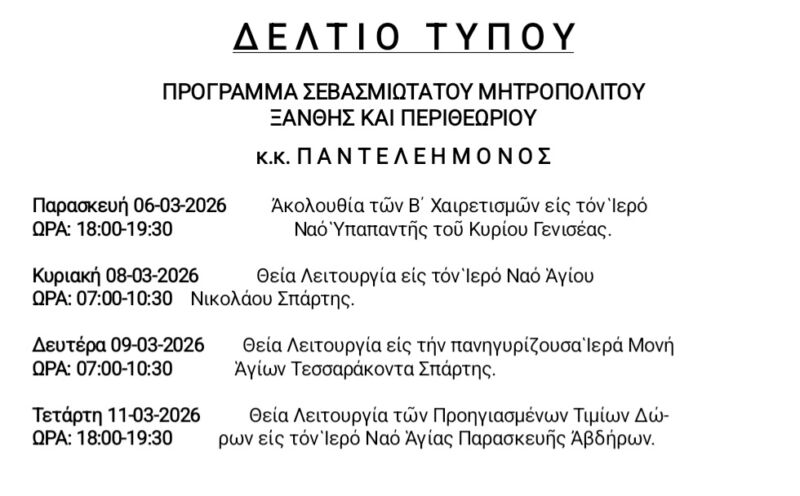 07 Mar 2026 ΠΡΟΓΡΑΜΜΑ ΣΕΒΑΣΜΙΩΤΑΤΟΥ κ.κ. ΠΑΝΤΕΛΕΗΜΟΝΟΣ 7 March 2026 16 Views Ανακοινώσεις, Δελτία Τύπου, Εκδηλώσεις, Ενορίες, Επιλεγμένα, Ιερές Μονές, Ιστορικό, Πρόγραμμα Σεβασμιωτάτου