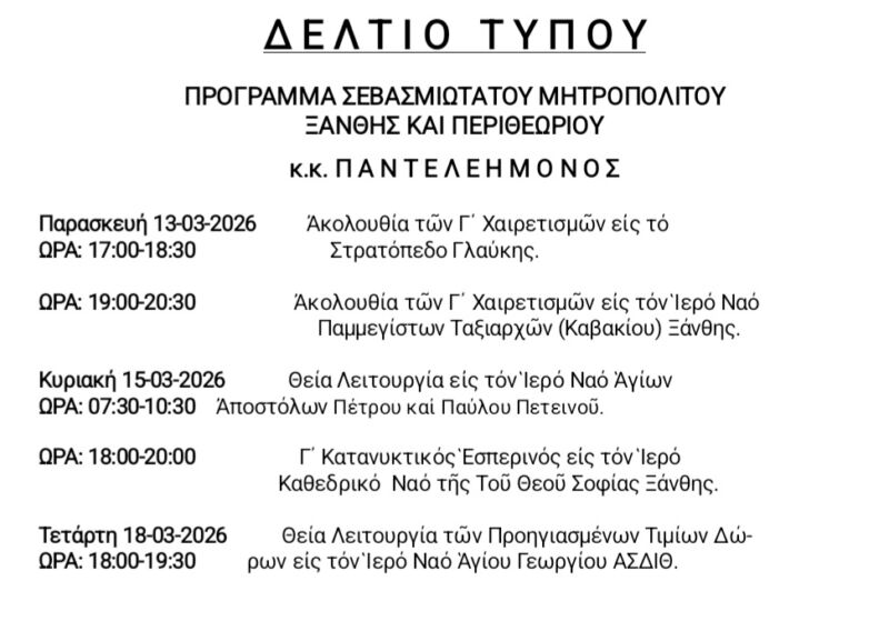 12 Mar 2026 ΠΡΟΓΡΑΜΜΑ ΣΕΒΑΣΜΙΩΤΑΤΟΥ κ.κ. ΠΑΝΤΕΛΕΗΜΟΝΟΣ 12 March 2026 9 Views Ανακοινώσεις, Δελτία Τύπου, Εκδηλώσεις, Ενορίες, Επιλεγμένα, Ιερές Μονές, Ιστορικό, Πρόγραμμα Σεβασμιωτάτου