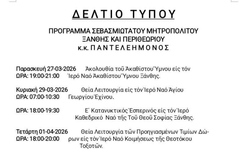 26 Mar 2026 ΠΡΟΓΡΑΜΜΑ ΣΕΒΑΣΜΙΩΤΑΤΟΥ κ.κ. ΠΑΝΤΕΛΕΗΜΟΝΟΣ 26 March 2026 9 Views Ανακοινώσεις, Δελτία Τύπου, Εκδηλώσεις, Ενορίες, Επιλεγμένα, Ιερές Μονές, Ιστορικό, Πρόγραμμα Σεβασμιωτάτου