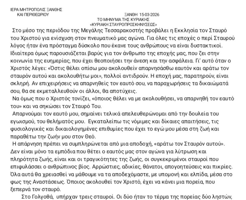 12 Mar 2026 ΤΟ ΜΗΝΥΜΑ ΤΗΣ ΚΥΡΙΑΚΗΣ 12 March 2026 6 Views Ανακοινώσεις, Ενορίες, Επιλεγμένα, Ιερές Μονές, Ιστορικό, Το κήρυγμα της Κυριακής