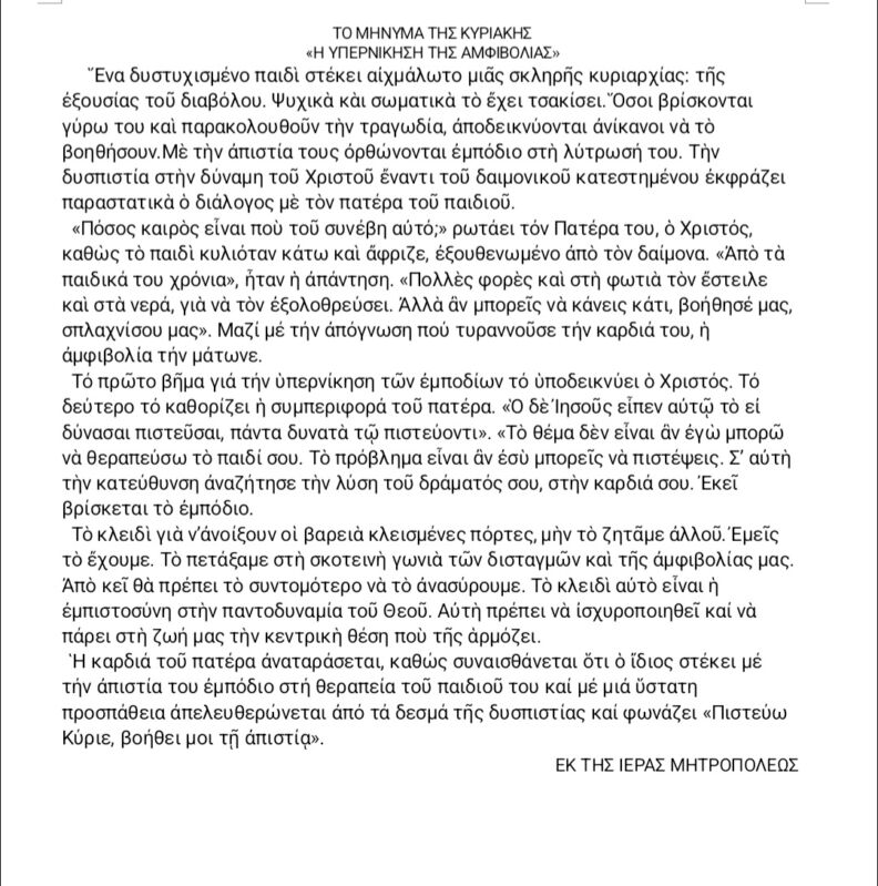 19 Mar 2026 ΤΟ ΜΗΝΥΜΑ ΤΗΣ ΚΥΡΙΑΚΗΣ 19 March 2026 6 Views Ανακοινώσεις, Δελτία Τύπου, Ενορίες, Επιλεγμένα, Ιερές Μονές, Ιστορικό, Το κήρυγμα της Κυριακής