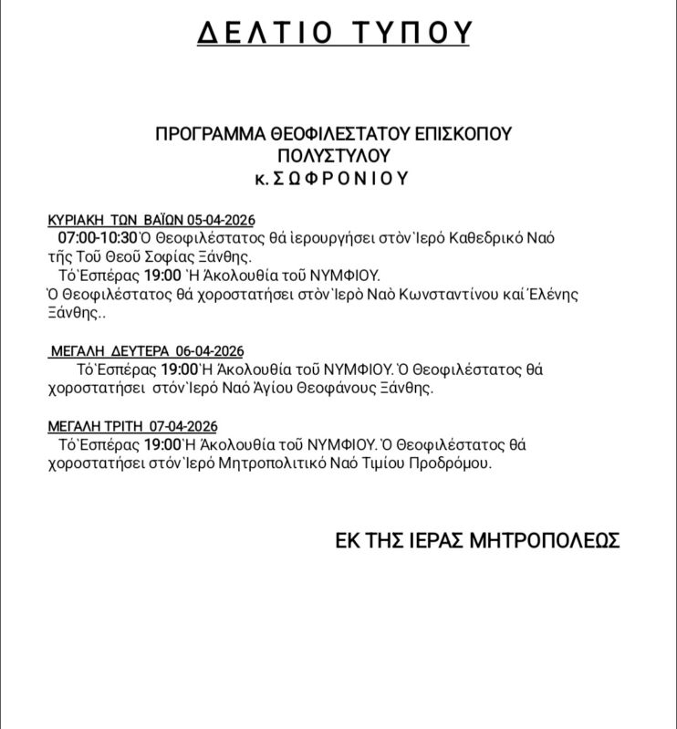 02 Apr 2026 ΠΡΟΓΡΑΜΜΑ ΘΕΟΦΙΛΕΣΤΑΤΟΥ ΕΠΙΣΚΟΠΟΥ ΠΟΛΥΣΤΥΛΟΥ κ. ΣΩΦΡΟΝΙΟΥ 2 April 2026 10 Views Ανακοινώσεις, Δελτία Τύπου, Εκδηλώσεις, Ενορίες, Επιλεγμένα, Ιερές Μονές, Ιστορικό