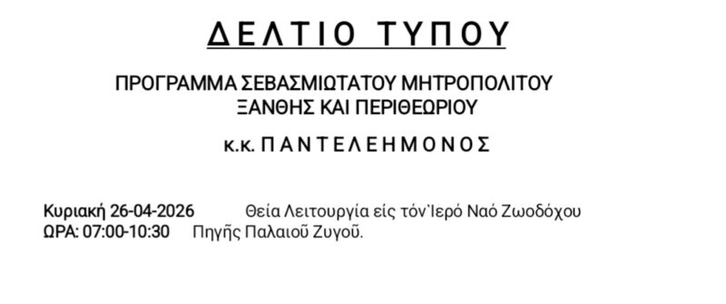 24 Apr 2026 ΠΡΟΓΡΑΜΜΑ ΣΕΒΑΣΜΙΩΤΑΤΟΥ κ.κ. ΠΑΝΤΕΛΕΗΜΟΝΟΣ 24 April 2026 9 Views Ανακοινώσεις, Δελτία Τύπου, Εκδηλώσεις, Ενορίες, Επιλεγμένα, Ιερές Μονές, Ιστορικό, Πρόγραμμα Σεβασμιωτάτου