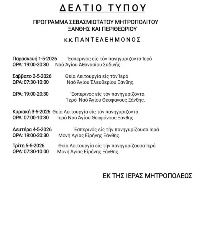 30 Apr 2026 ΠΡΟΓΡΑΜΜΑ ΣΕΒΑΣΜΙΩΤΑΤΟΥ κ.κ. ΠΑΝΤΕΛΕΗΜΟΝΟΣ 30 April 2026 15 Views Ανακοινώσεις, Δελτία Τύπου, Εκδηλώσεις, Ενορίες, Επιλεγμένα, Ιερές Μονές, Ιστορικό, Πρόγραμμα Σεβασμιωτάτου