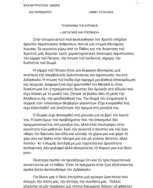 16 Apr 2026 ΤΟ ΜΗΝΥΜΑ ΤΗΣ ΚΥΡΙΑΚΗΣ 16 April 2026 11 Views Ανακοινώσεις, Ενορίες, Επιλεγμένα, Ιερές Μονές, Ιστορικό, Το κήρυγμα της Κυριακής