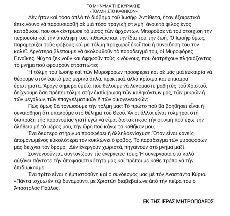24 Apr 2026 ΤΟ ΜΗΝΥΜΑ ΤΗΣ ΚΥΡΙΑΚΗΣ 24 April 2026 4 Views Ανακοινώσεις, Ενορίες, Επιλεγμένα, Ιερές Μονές, Ιστορικό, Το κήρυγμα της Κυριακής